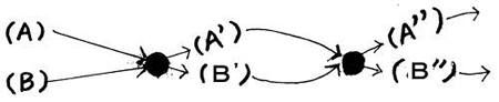 (A)が、(B)とであうと、いままでの(A)ではなく(A')になり、(B)も(B')になってしまいます。